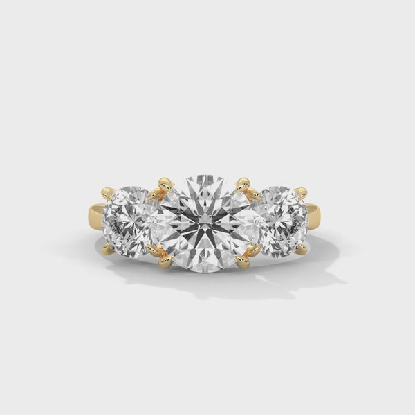 Celebrate your love story with this Three-Stone Lab Grown Diamond Gold Ring, beautifully symbolizing the past, present, and future. The centerpiece features a radian round-cut lab grown diamond, perfectly flanked by two side diamonds. The four-prong cathedral setting elegantly lifts each stone to capture light from every angle, ensuring breathtaking brilliance. A sleek, polished gold band enhances the refined symmetry and timeless appeal of this luxurious ring.