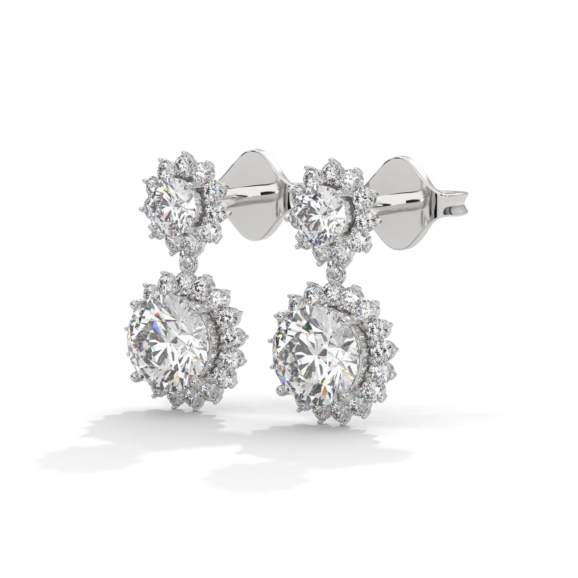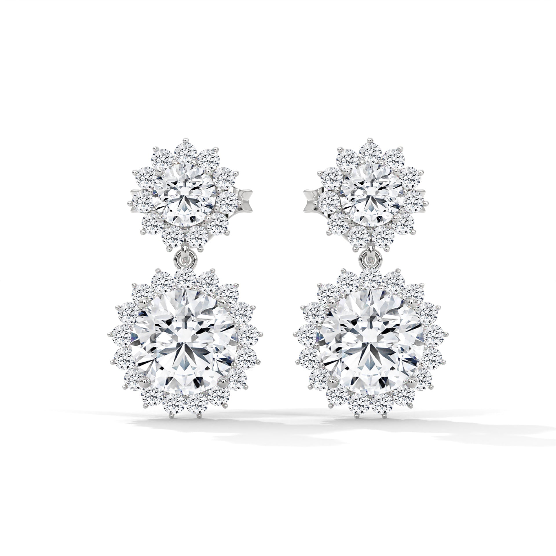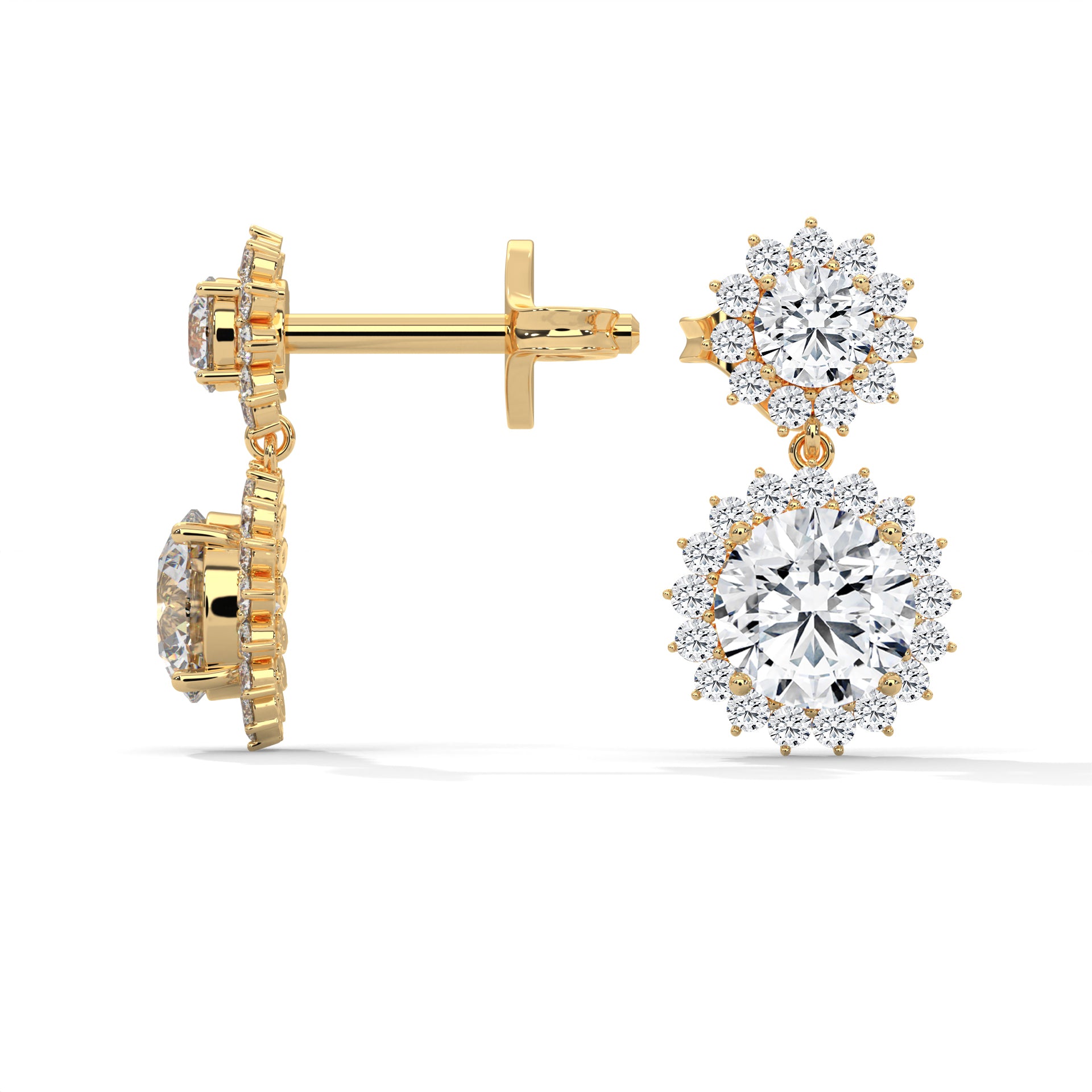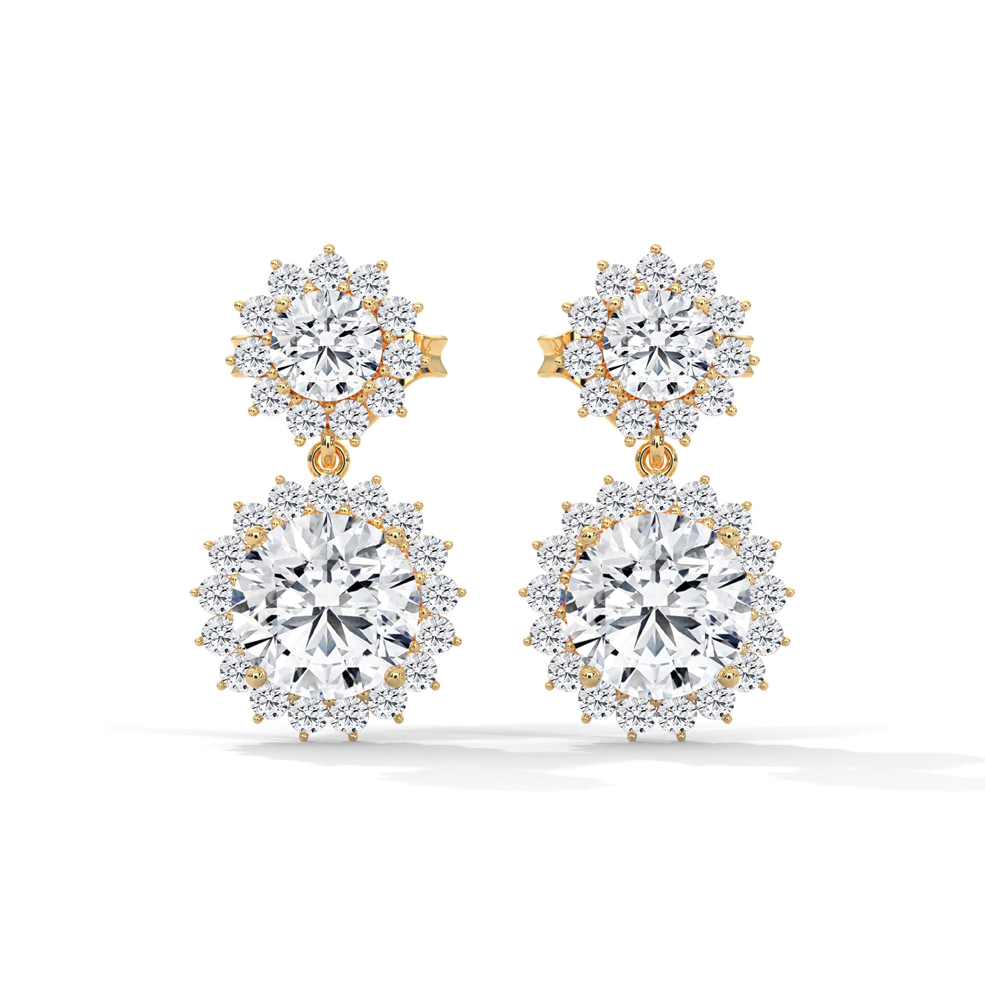Twilight Bloom Double Halo Lab Grown Round Diamond Gold Drop Earrings