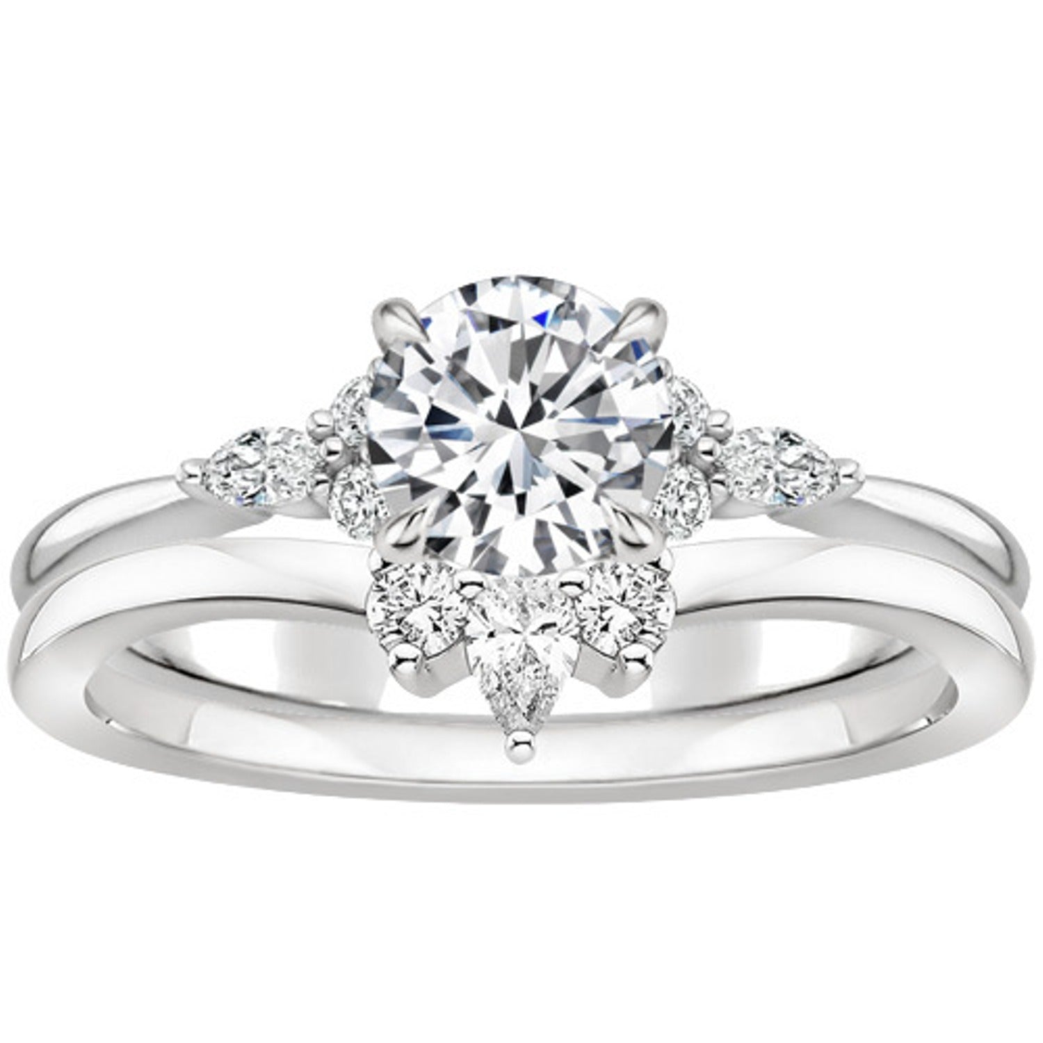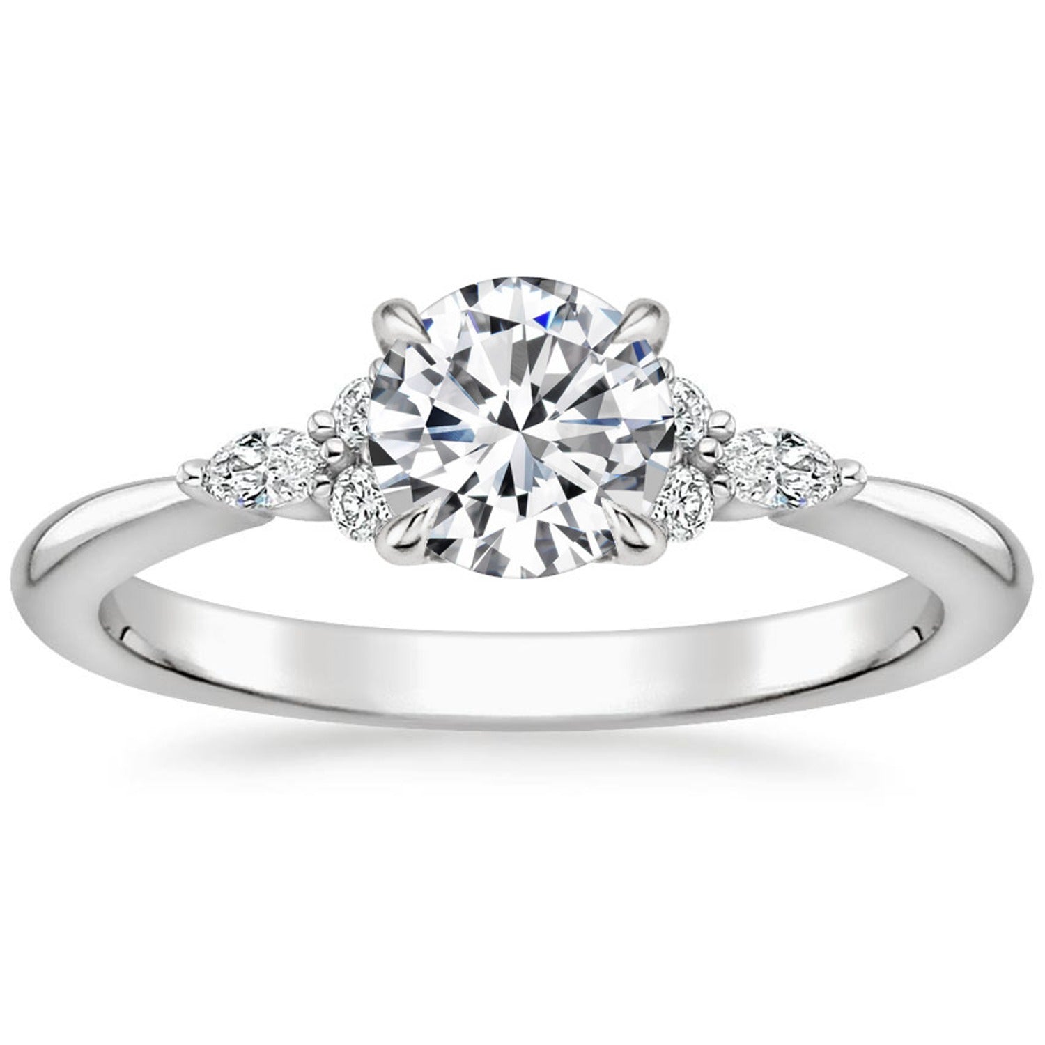 The Virelle Bloom ring features a brilliant round diamond flanked by marquise and pavé-set stones, evoking the soft, organic elegance of blossoming petals.