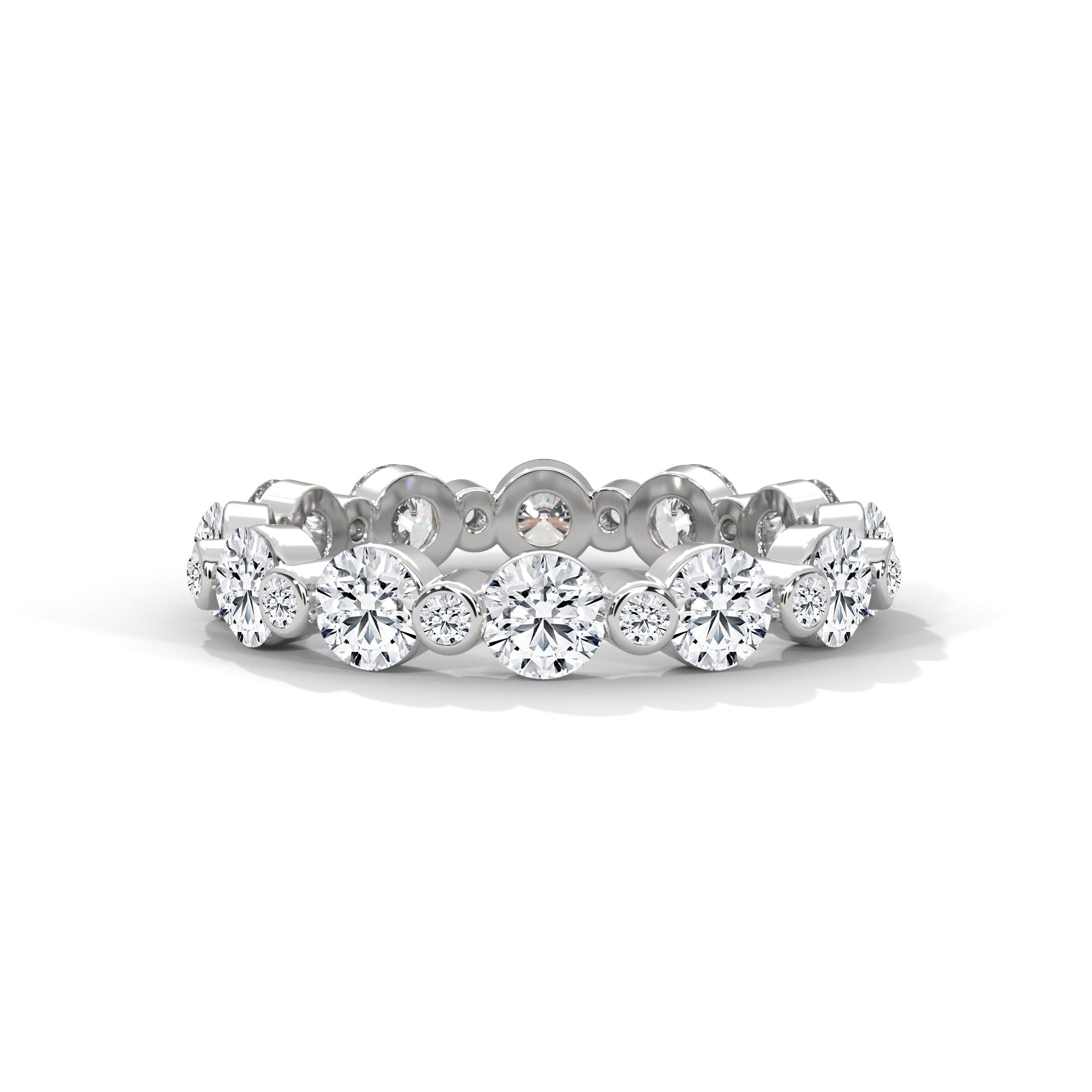The alternating diamond design adds visual rhythm and dimension, giving the ring a unique and luxurious appeal. Each lab-grown diamond is encased in a sleek bezel frame, maximizing brilliance while providing a soft, modern silhouette. Designed with alternating large and small round brilliant lab-grown diamonds, each stone is elegantly secured in a smooth bezel setting. Crafted in luminous 14K gold, this full eternity ring symbolizes infinite love and harmony — a perfect blend of classic design and contemporary artistry.
