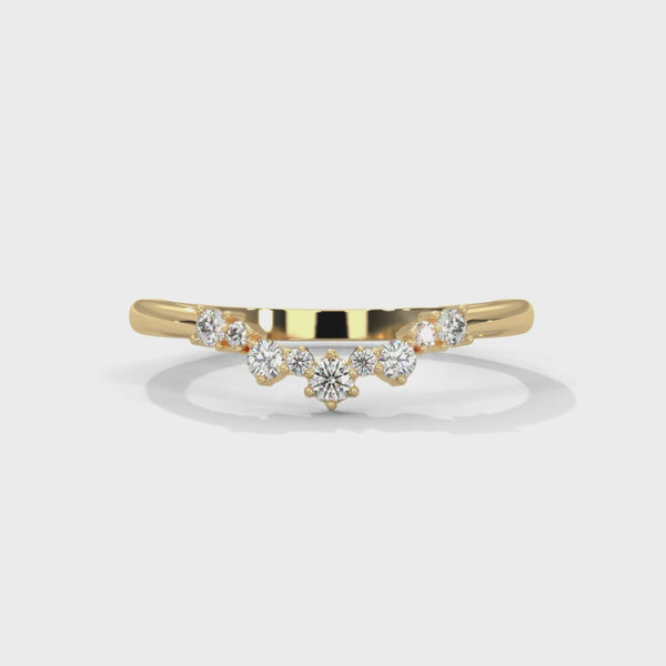 This graceful lab-grown diamond gold ring features a delicate row of sparkling round-cut diamonds, elegantly set in a sleek gold band. The unique curved arrangement of stones adds a modern twist to a timeless design, making it perfect for stacking or wearing solo. Lightweight yet radiant, this ring blends sophistication with everyday wearability.