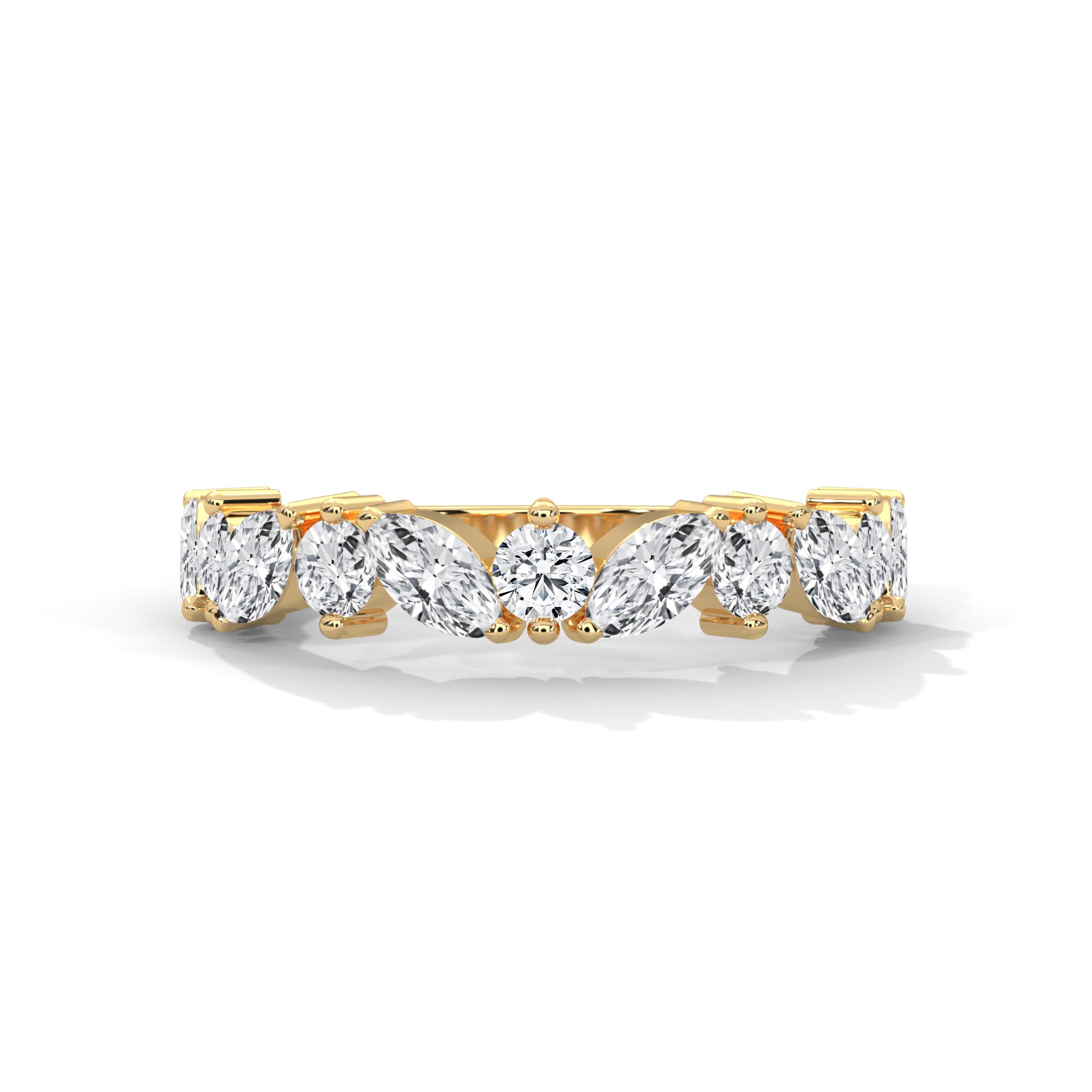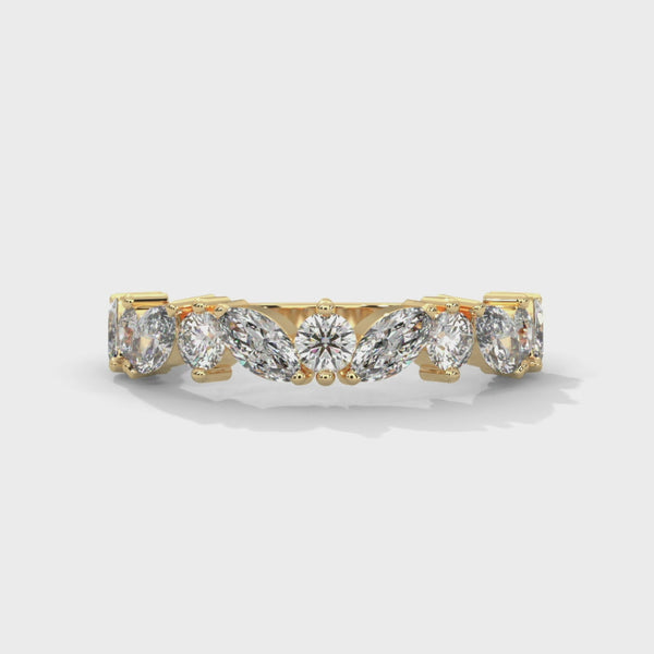 This exquisite gold ring features alternating marquise-cut and round brilliant cut lab-grown diamonds, meticulously set in a sleek 14K gold band. Each diamond is hand-selected for exceptional clarity and sparkle, creating a continuous shimmer that captures light from every angle.