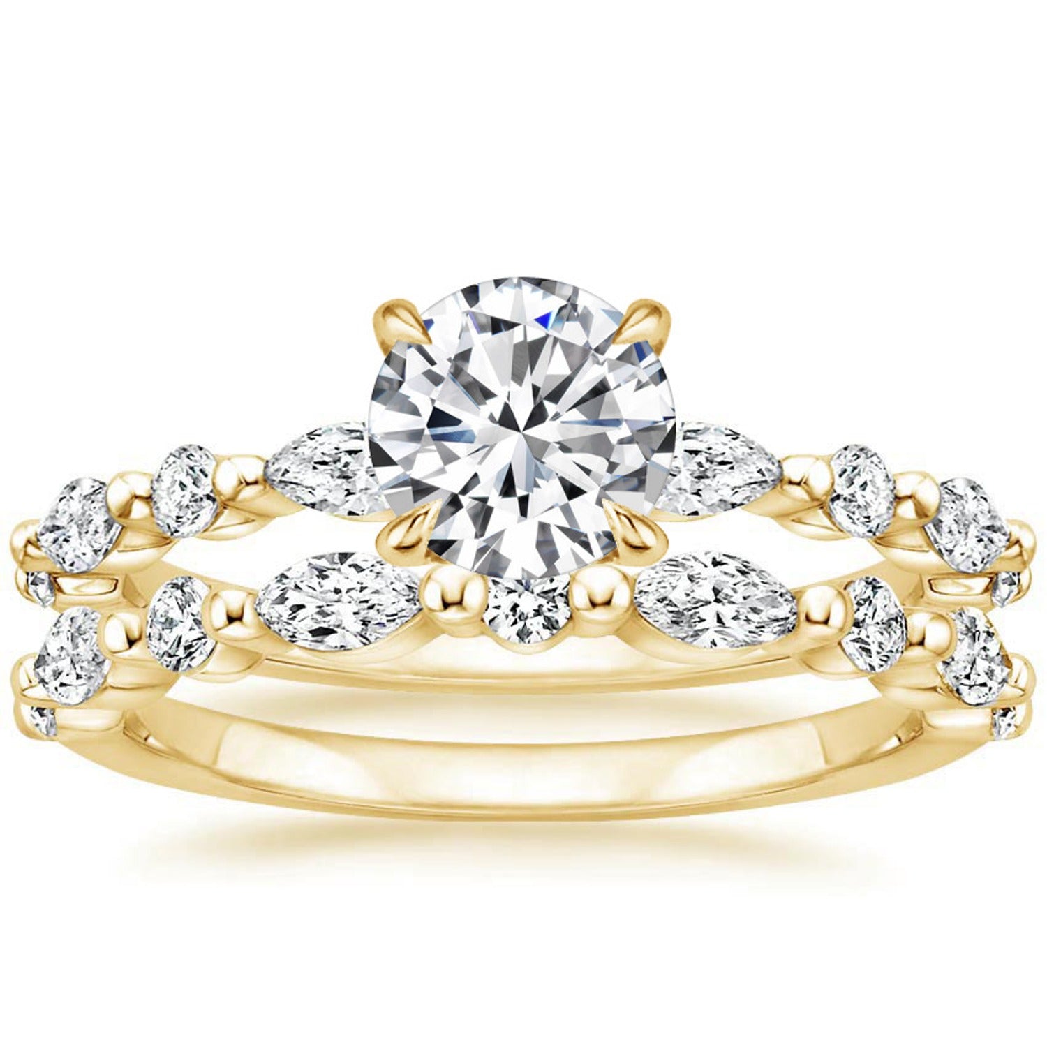 This luxurious yellow gold diamond ring showcases a brilliant round center stone paired with a uniquely elegant marquise diamond band, creating a dazzling statement of sophistication. Designed for those who desire timeless beauty with a modern twist, this ring features expertly set diamonds that maximize sparkle and brilliance from every angle. The combination of marquise and round diamonds adds depth, texture, and eye-catching radiance. Perfect as an engagement ring, anniversary gift, or luxury keepsake, this piece elevates any jewelry collection. Crafted with exceptional precision, it symbolizes everlasting love, style, and refined elegance—making it a standout choice for any special moment.