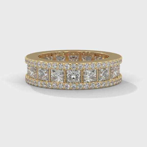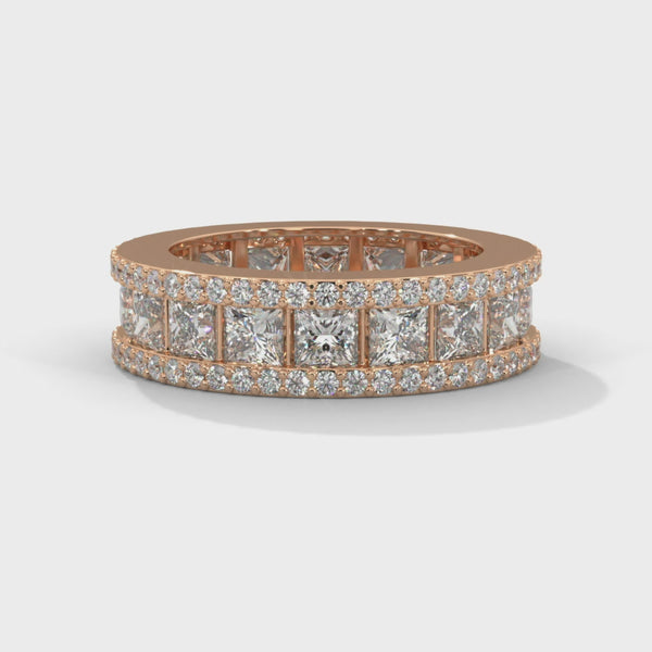 Step into timeless brilliance with this luxurious lab grown diamond eternity ring. Featuring a stunning dual-row design, this masterpiece combines princess-cut diamonds at the center with a delicate halo of round-cut lab grown diamonds on both edges — creating an endless sparkle from every angle.
