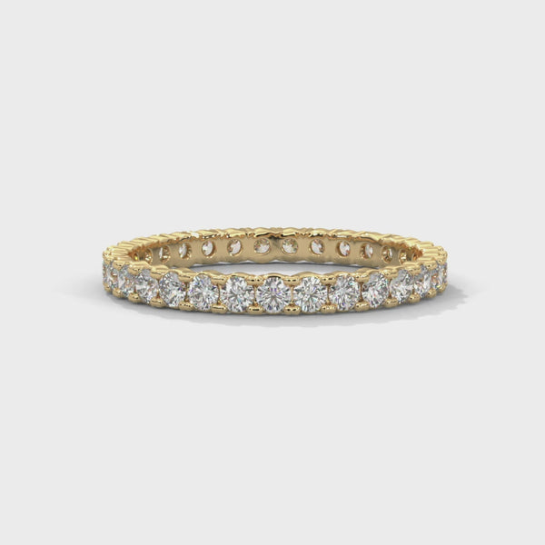 This ring features a classic eternity band design, The term “eternity” refers to the way the diamonds are set continuously around the entire band, forming an unbroken circle of brilliance — a perfect metaphor for eternal commitment.Each diamond in the ring is a lab-grown round brilliant cut, chosen for its exceptional sparkle and symmetry. The stones are set using a prong setting, which securely holds each diamond while allowing maximum light to pass through, enhancing their brilliance and fire. The 14K gold band — available in yellow, rose, or white gold — provides a strong yet elegant base that complements the brilliance of the diamonds. Its slender profile gives the ring a delicate and timeless look, making it ideal for stacking with engagement rings or wearing solo as a statement of refined simplicity.
