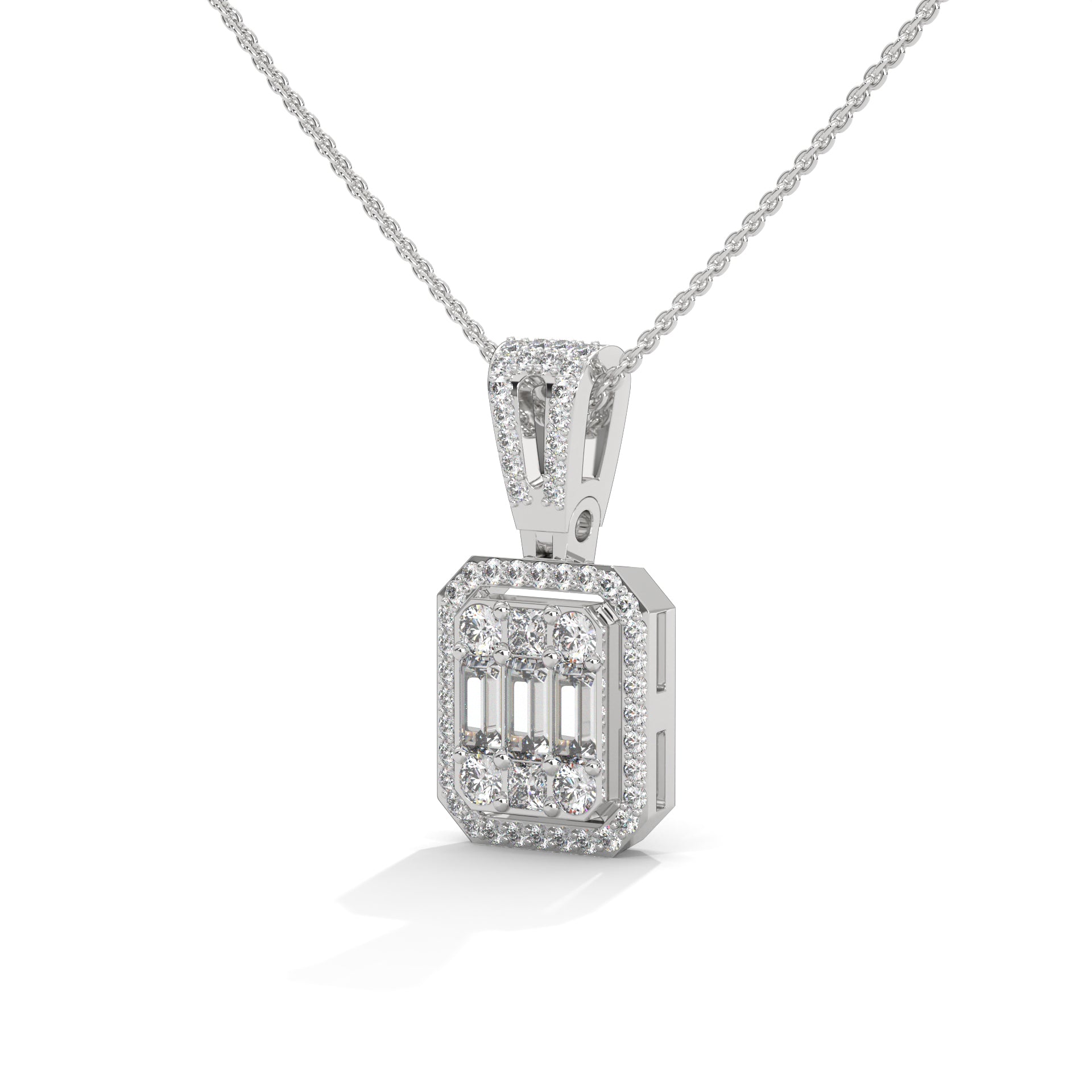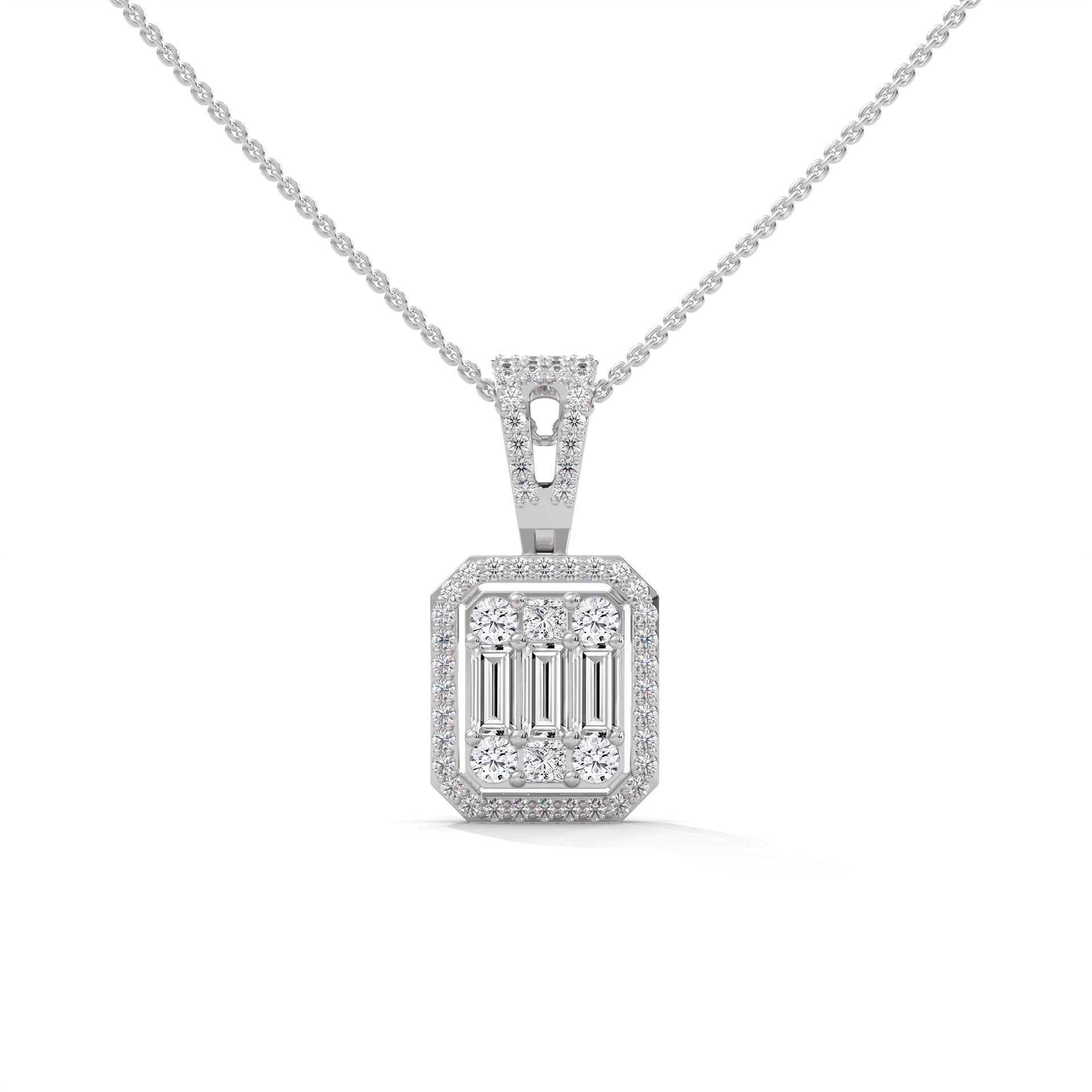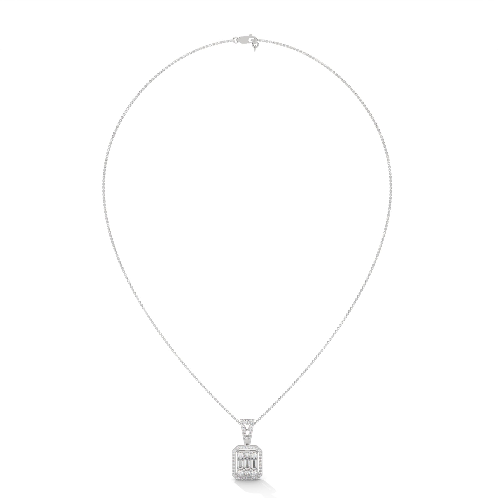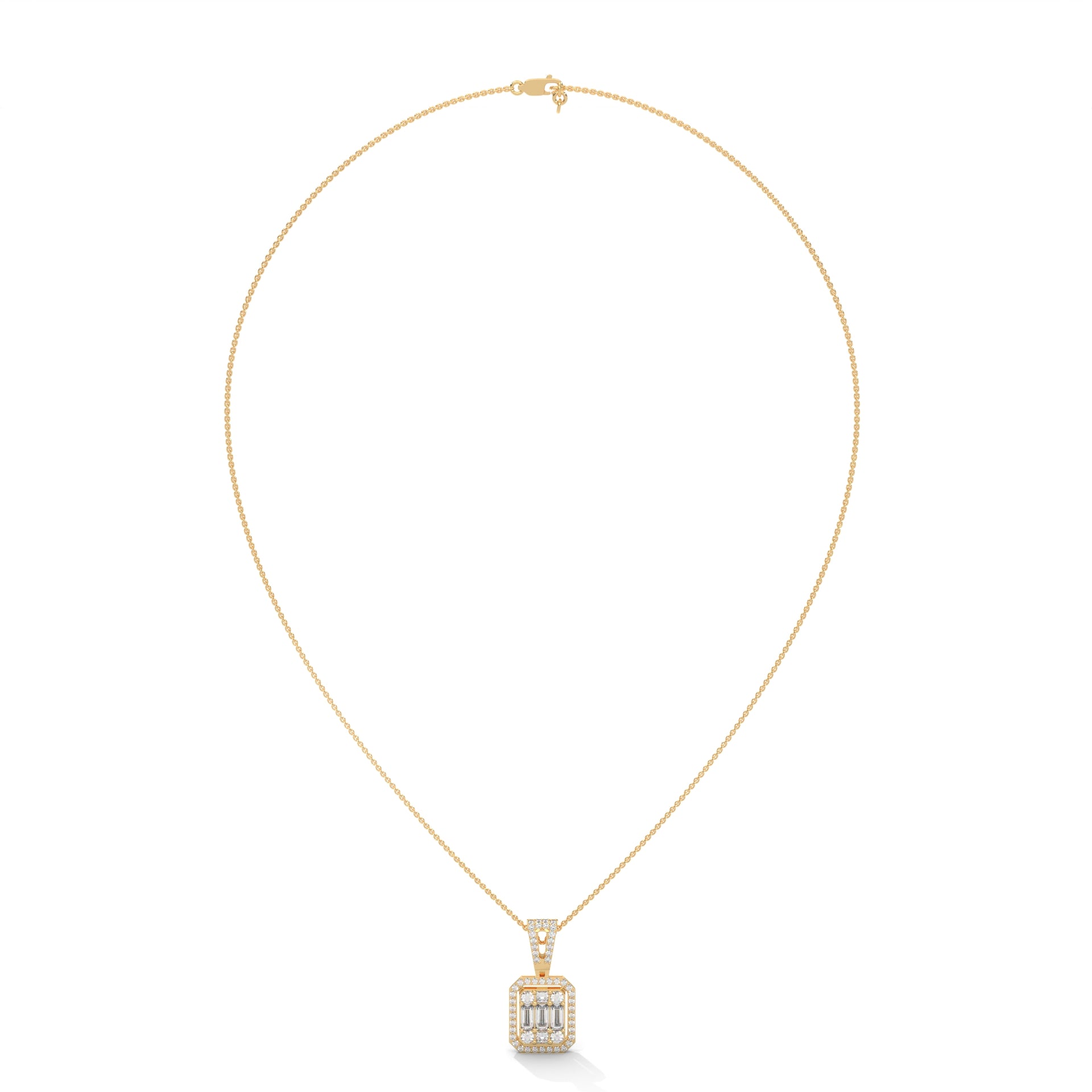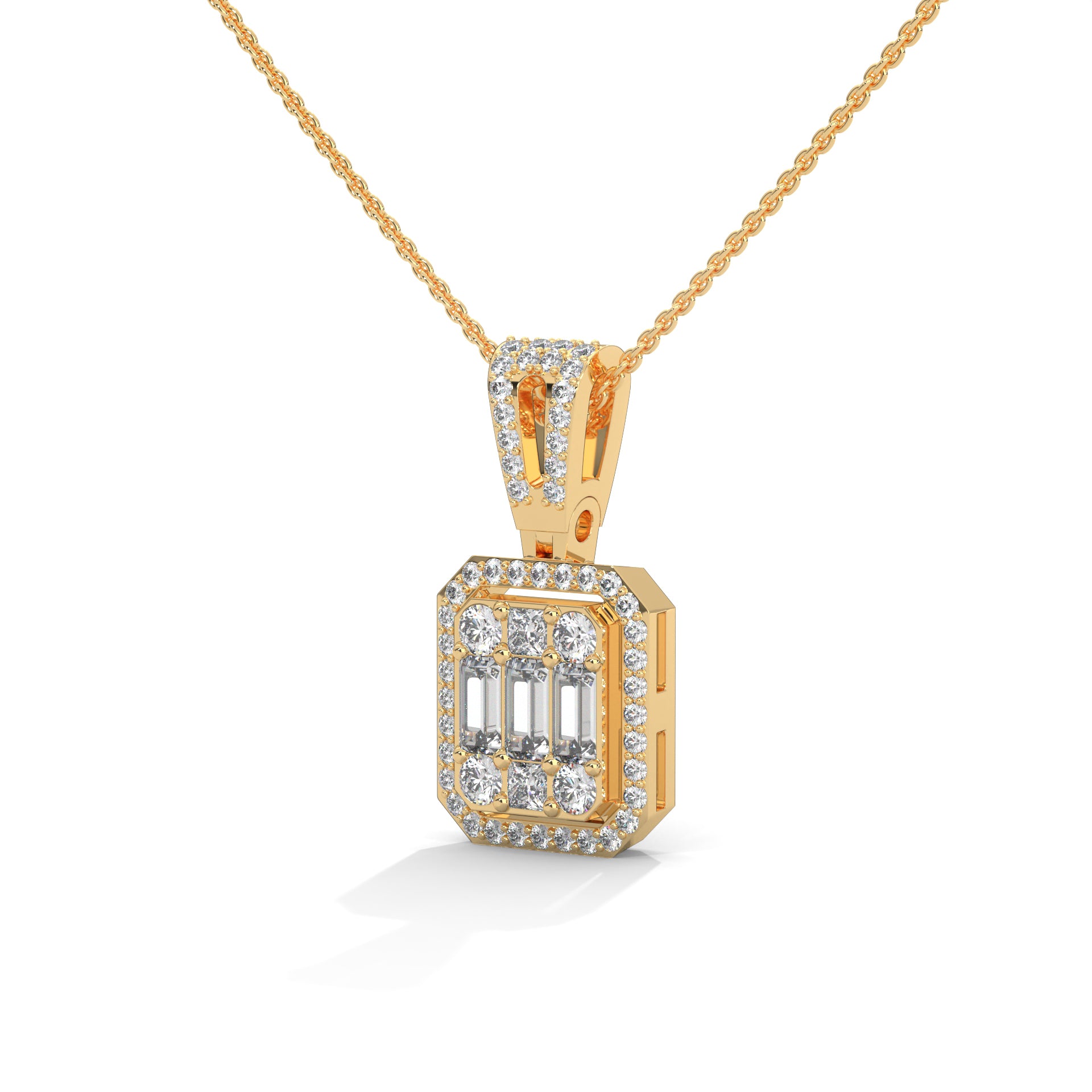 this Lab Grown Diamond Gold Pendant Chain, a masterpiece that captures both modern glamour and classic luxury. The pendant features an elegant rectangular frame, set with a stunning combination of baguette and round-cut lab-grown diamonds. The center showcases three baguette diamonds aligned vertically, surrounded by round brilliants that amplify the pendant’s sparkle and depth. A diamond-studded bail adds an extra touch of brilliance.