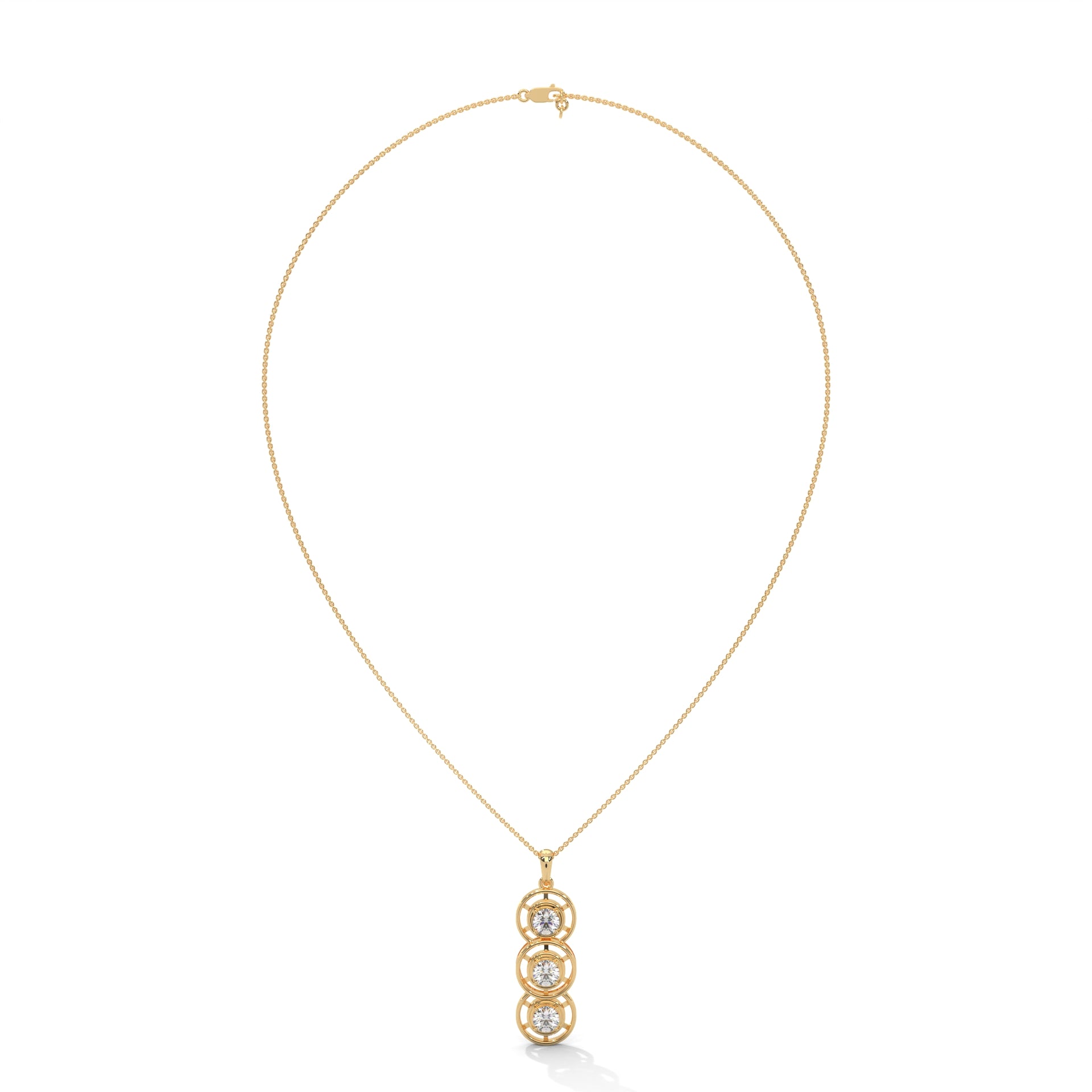 Sophisticated and symbolic, this Lab Grown Diamond Gold Pendant Chain features a stunning trio of round brilliant diamonds, representing the past, present, and future of your journey. Each diamond is securely set in a sleek bezel frame of 14K yellow gold, offering both modern elegance and timeless appeal.