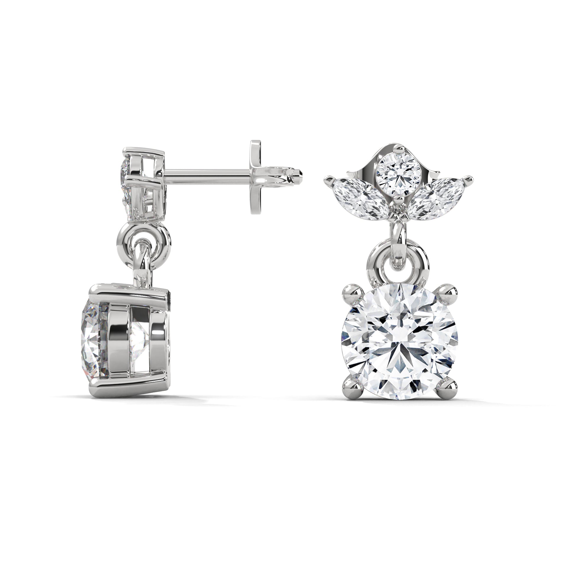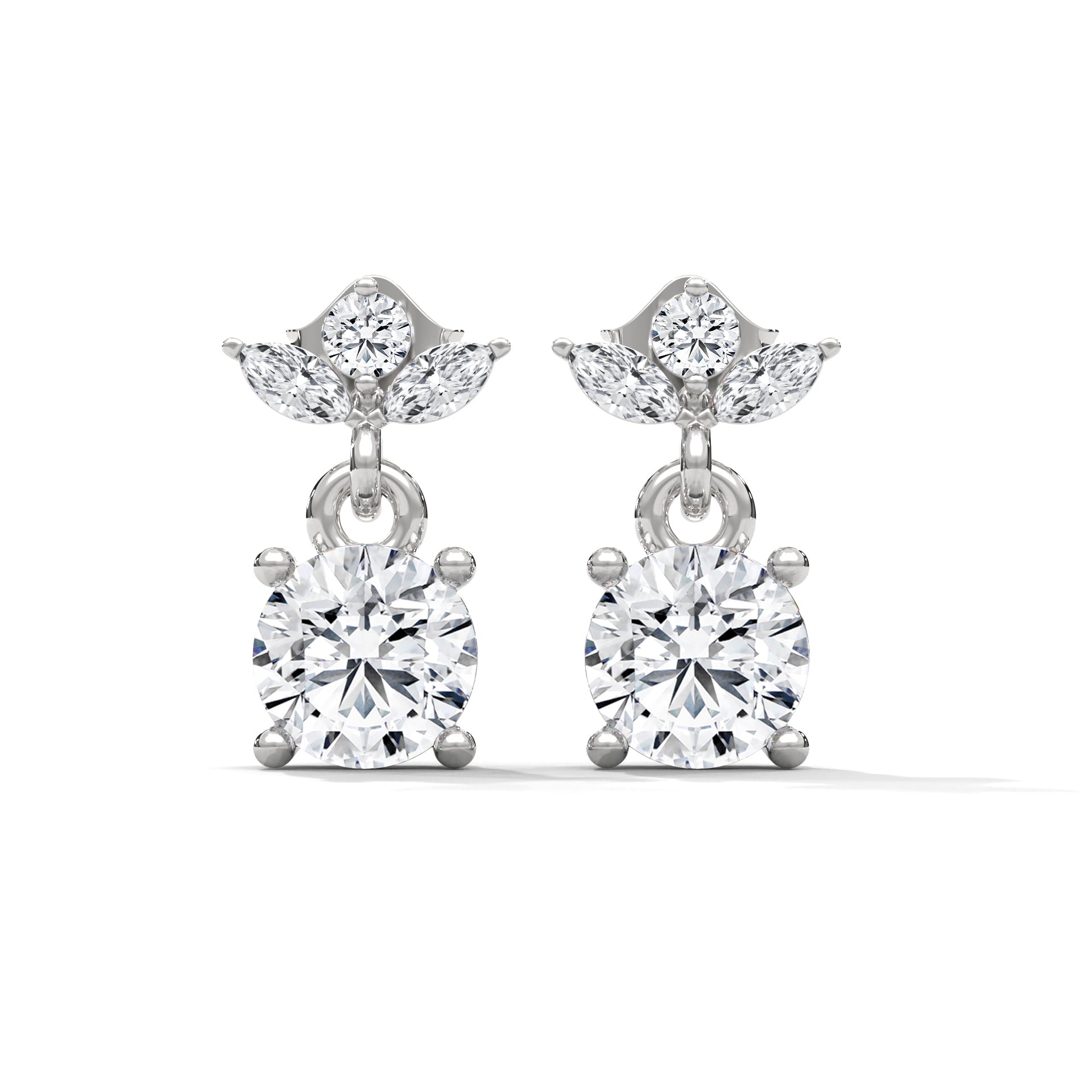 The design begins with three marquise-cut diamonds arranged like delicate petals — symbolizing grace, elegance, and harmony. Below hangs a round brilliant diamond, creating a dynamic drop that reflects light beautifully with every turn. Crafted in 14K solid gold, this design balances sparkle and sophistication, creating a piece that radiates both modern luxury and timeless femininity. The gentle swing of the diamond drop enhances its brilliance, making these earrings perfect for adding effortless glamour to any look.