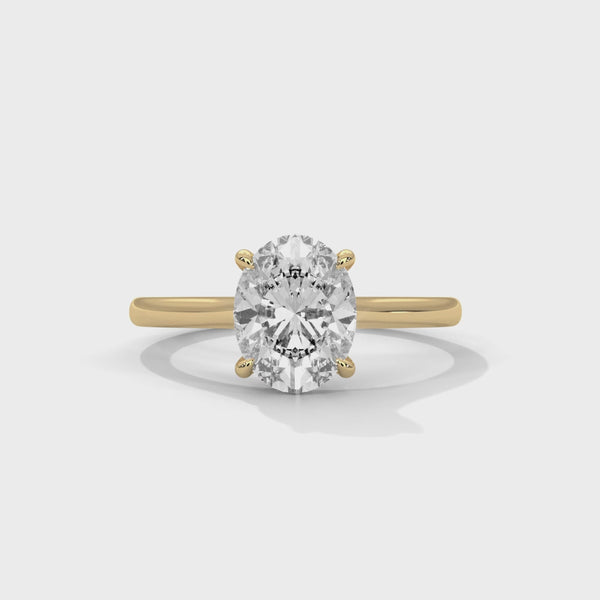 Classic Solitaire Oval Cut Lab Grown Diamond Gold Ring, a symbol of grace and everlasting love. At its center gleams oval-cut lab grown diamond, prized for its elongated shape and exceptional brilliance that flatters every hand. The diamond is held securely in a four-prong solitaire setting, allowing maximum light reflection and brilliance from every angle. The ring’s tapered shank and smooth polished finish create a perfectly balanced silhouette