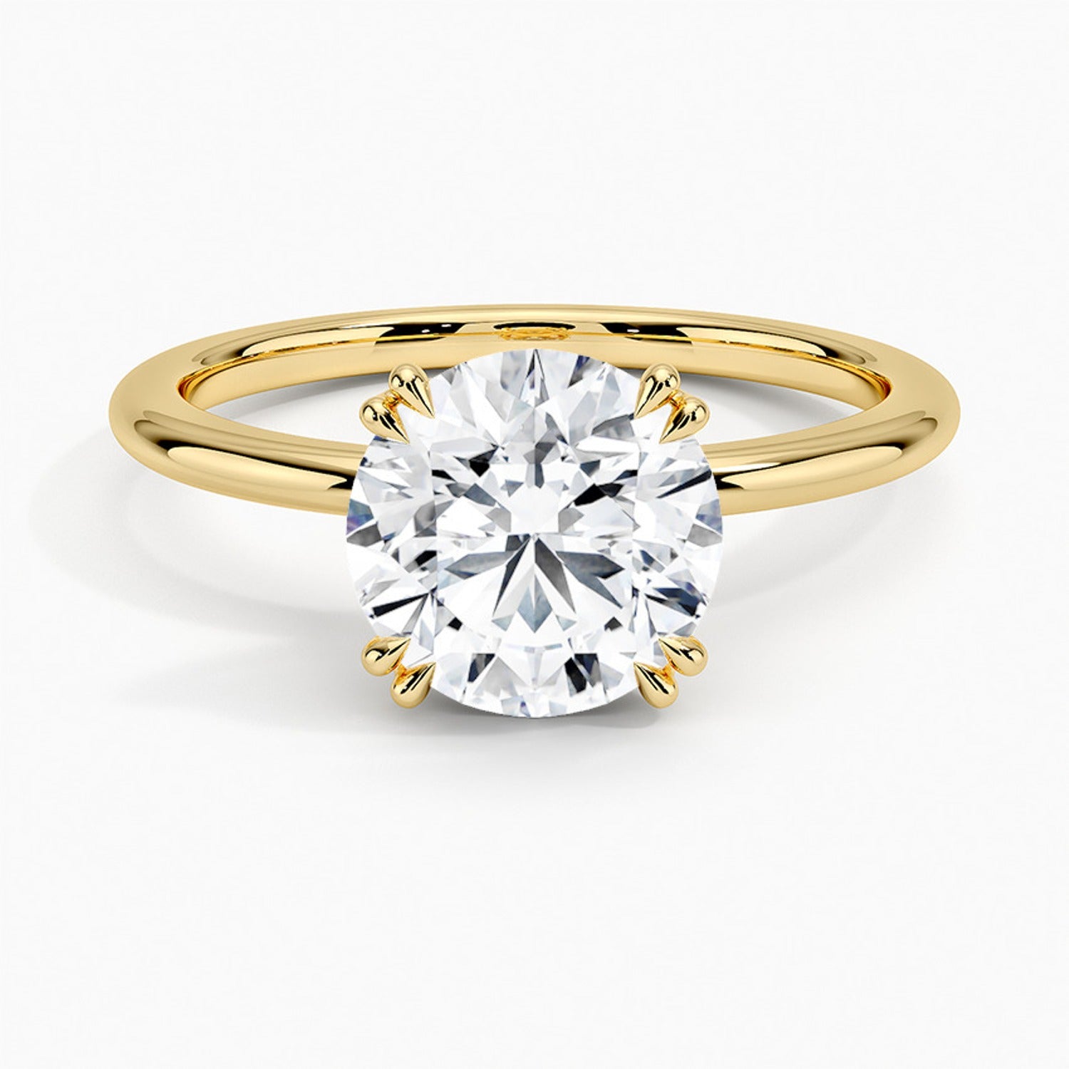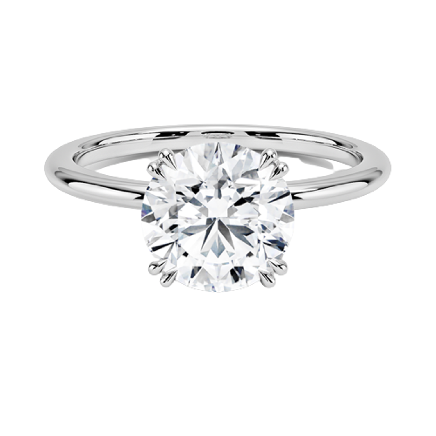 Elodie Whisper enchants with its delicate silhouette and double claw prongs that gently embrace a brilliant round diamond, floating effortlessly atop a slender white gold band.
