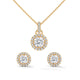 Embrace elegance with the Radiant Bloom Set, a refined jewelry ensemble crafted in radiant rose gold. This captivating set includes a striking pendant necklace and matching stud earrings, each showcasing a brilliant round-cut diamond secured in a unique crown-like floral setting. The pendant is elevated by a vertical bail adorned with smaller pavé-set diamonds, adding an extra layer of sophistication and shimmer.