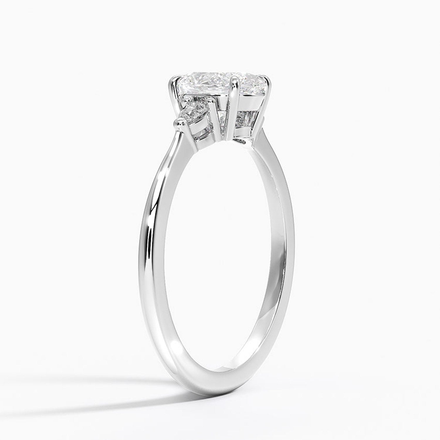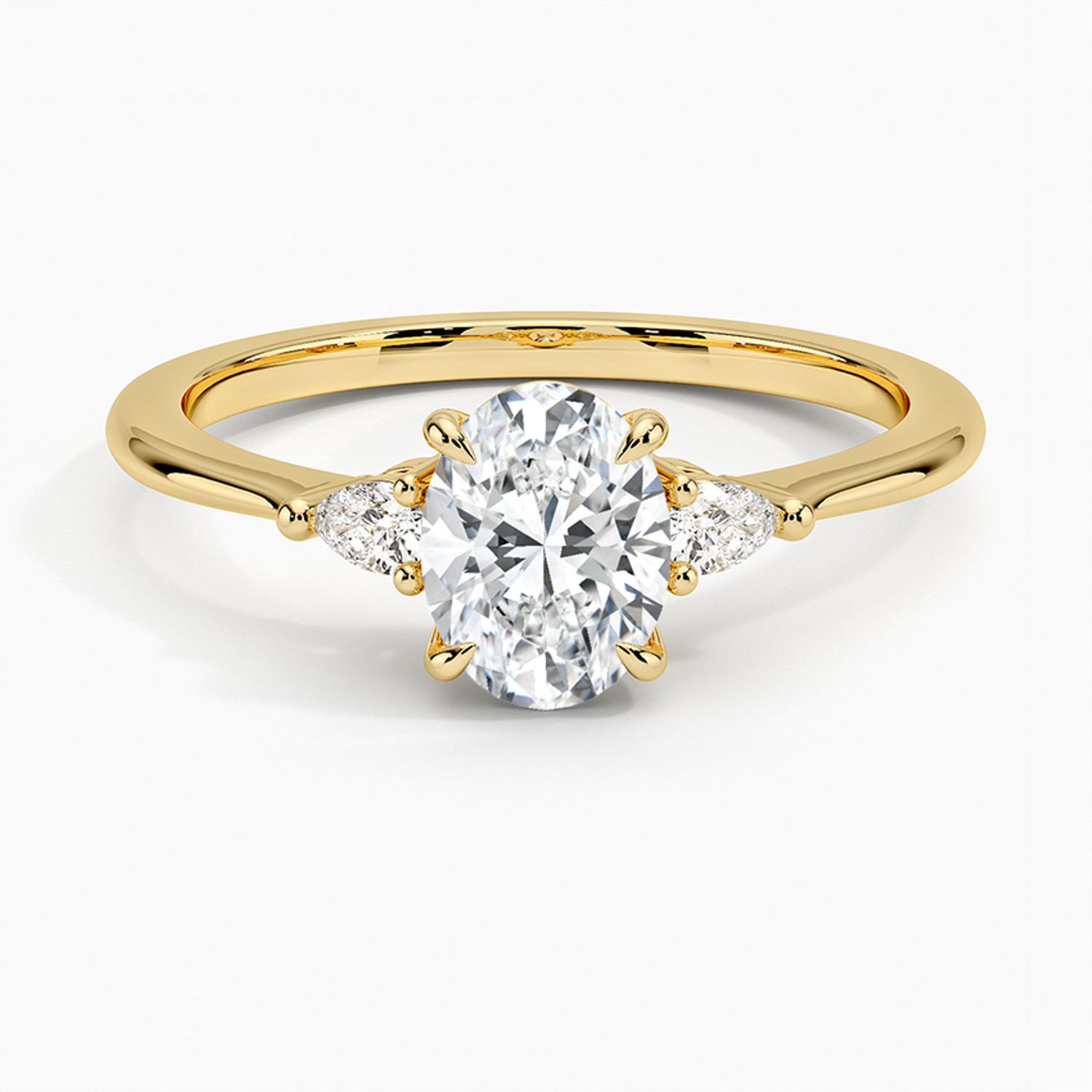 An elegant three-stone ring featuring a radiant oval center gem embraced by soft pear-cut side stones.