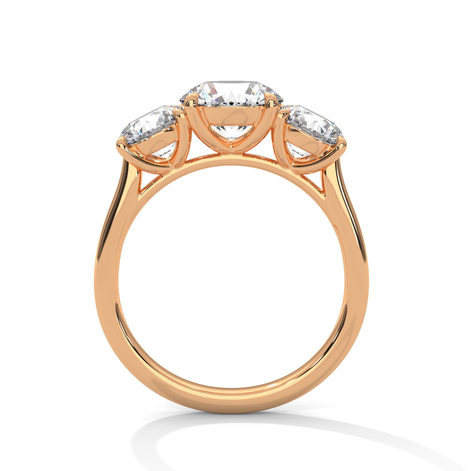 Celebrate life’s cherished moments with this Three-Stone Lab Grown Diamond Gold Ring, a timeless symbol of love’s past, present, and future. The captivating design features round-cut lab grown diamond at the center, flanked by two matching side diamonds (6.00 × 6.00 mm each) stunning brilliance. Each stone is secured in a six-prong cathedral setting, designed to maximize sparkle and enhance the elegant curvature of the band. The smooth, polished shank provides balance and comfort while maintaining a luxurious aesthetic.