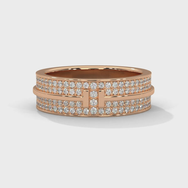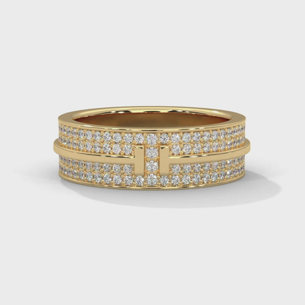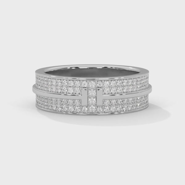 Exuding power, precision, and elegance, this Lab Grown Diamond Gold Ring is a modern masterpiece that redefines sophistication. Featuring two parallel rows of Pave-set lab-grown diamonds, the band showcases a bold T-shaped centerpiece that adds architectural symmetry and a contemporary edge.