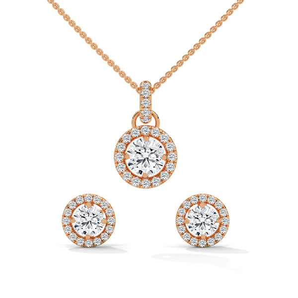 A dazzling rose gold pendant and earring set with shimmering round-cut diamonds encircled by a radiant halo, capturing elegance in every sparkle.