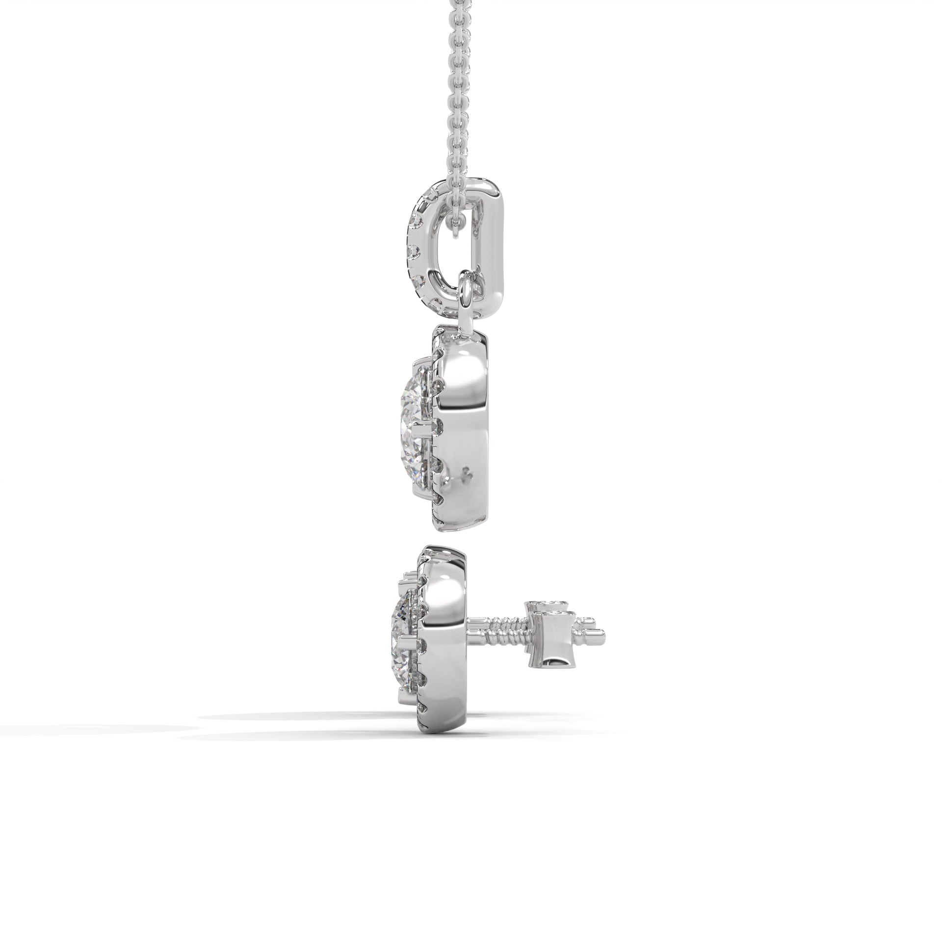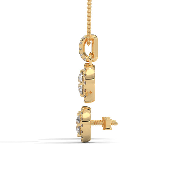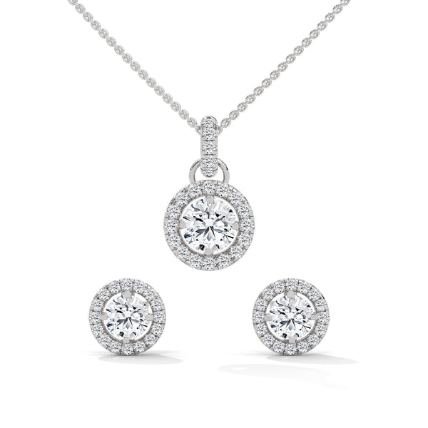 Timeless beauty meets modern brilliance in the Halo Grace Set. This elegant jewelry set features a classic round-cut diamond centerpiece in both the pendant and matching earrings, each surrounded by a luminous halo of finely set pavé diamonds. The rose gold setting adds a warm, romantic glow that enhances the sparkle of each stone.
