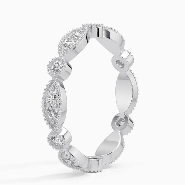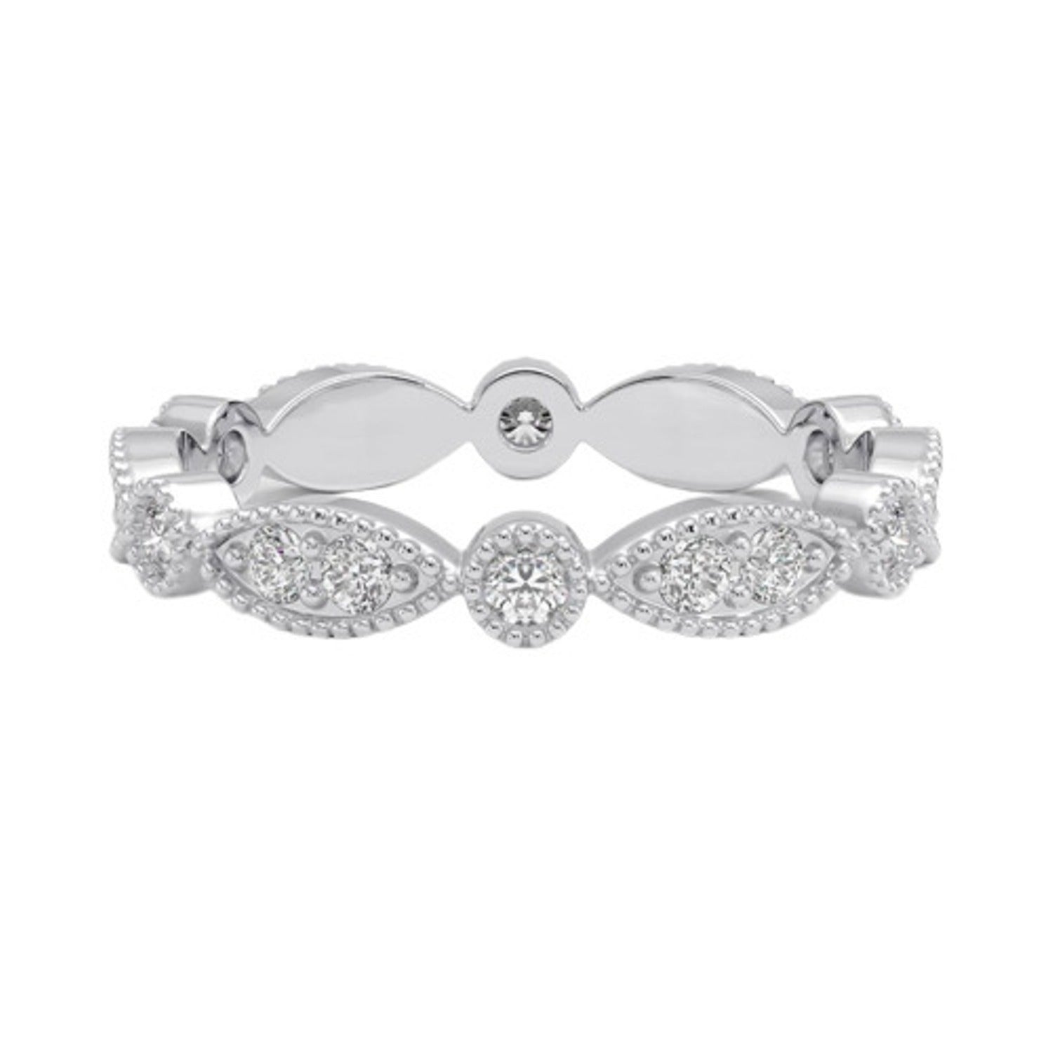 This elegant diamond eternity ring showcases a stunning vintage-inspired design, crafted in polished white metal for timeless brilliance. Featuring round-cut diamonds set within marquise-shaped and circular frames, it delivers exceptional sparkle from every angle. Intricate milgrain detailing enhances its antique charm, creating a delicate yet luxurious look. Perfect as a wedding band, anniversary ring, or stackable statement piece, this diamond ring combines classic artistry with modern elegance. Designed for women who appreciate fine craftsmanship and radiant beauty, this eternity ring is a meaningful symbol of everlasting love. A captivating choice for any special occasion.
