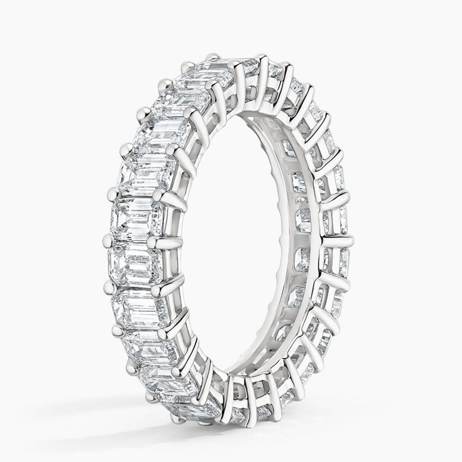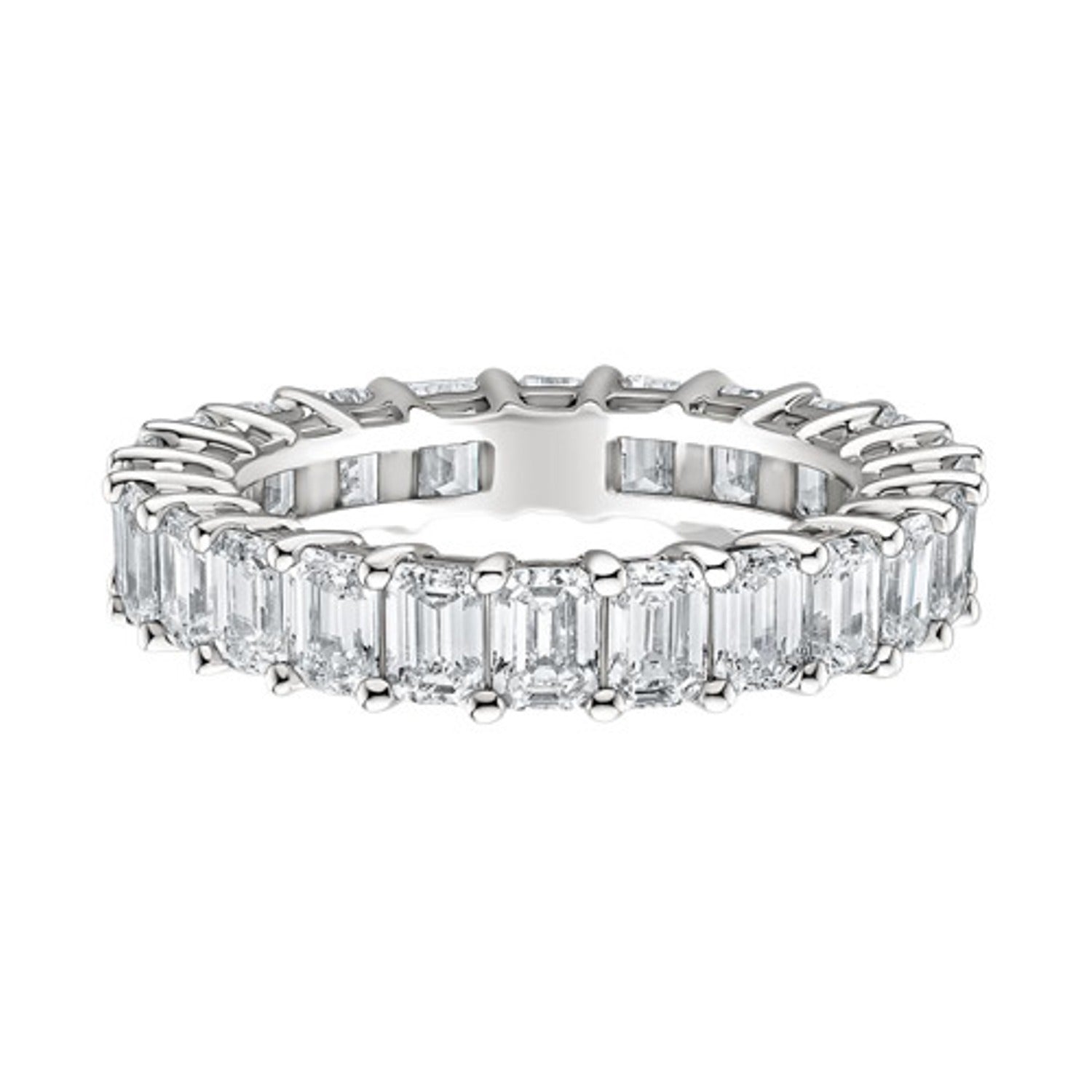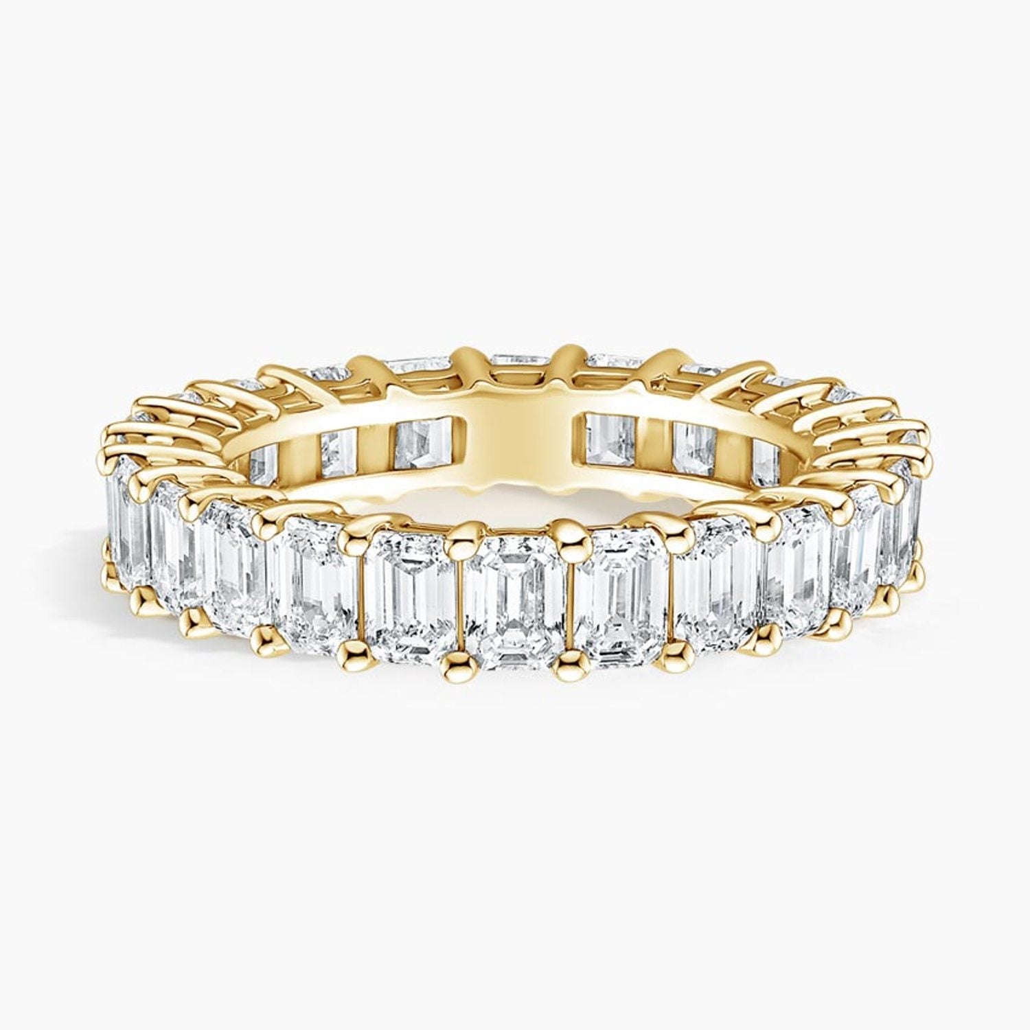 This stunning emerald-cut diamond eternity band showcases timeless luxury and exceptional brilliance. Crafted in premium yellow gold, the design features a continuous row of perfectly matched emerald-cut diamonds, each set in a secure prong setting to maximize sparkle from every angle. The elegant symmetry and clean lines create a sophisticated, modern aesthetic while maintaining classic appeal. Ideal as a wedding band, anniversary ring, or statement piece, this diamond eternity ring delivers unmatched radiance and enduring beauty. A perfect choice for those seeking a high-end, eye-catching diamond band with superior craftsmanship and luxurious design.