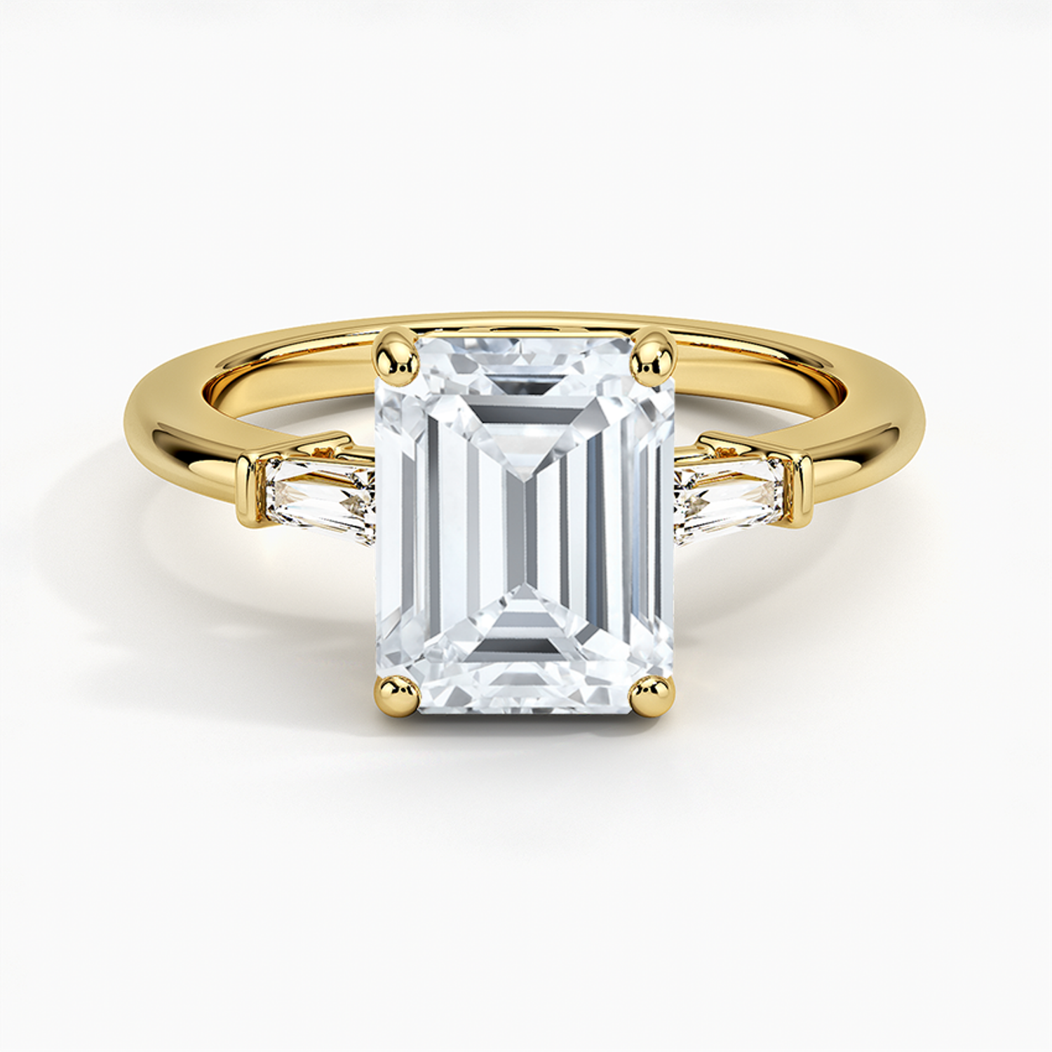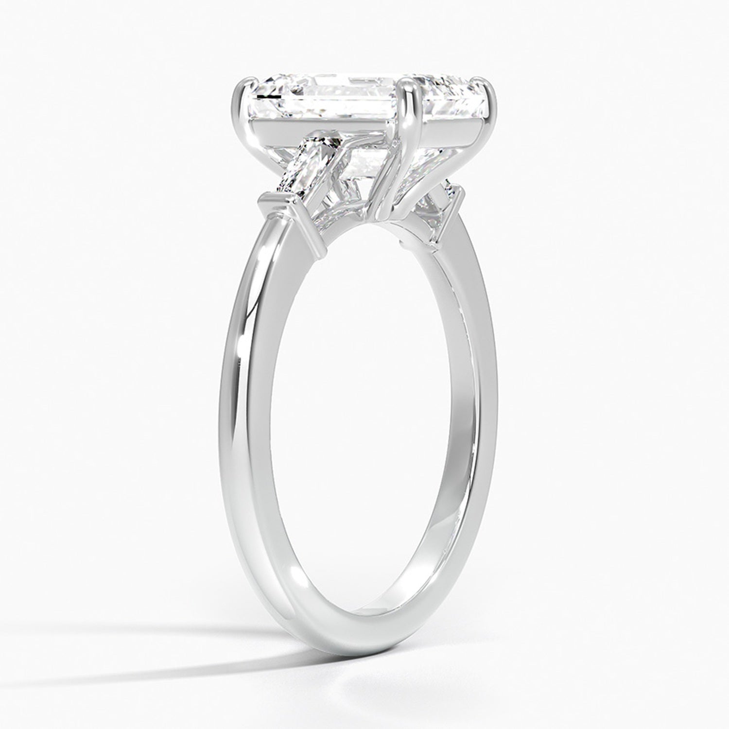 Bold yet effortlessly graceful, the Solmaris Crest ring is a celebration of clean lines and contemporary allure. At its heart lies a radiant emerald-cut diamond, known for its mirror-like clarity and elongated sophistication. Flanking it are precision-cut trapezoid diamonds that enhance the central gem’s brilliance while lending a striking, symmetrical silhouette. Set in a lustrous metal band with a refined, minimal profile, this ring is a perfect harmony of strength and beauty, ideal for those who admire sleek sophistication with timeless impact.